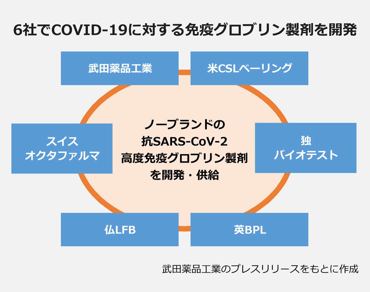開発するのは血漿分画製剤の一種である免疫グロブリン製剤。武田の血漿分画製剤事業はもともと、昨年1月に約6兆円で買収したアイルランド・シャイアーが強みとして抱えていた分野です。パンデミックという思わぬ形で、巨額買収の真価が試されることとなりました。