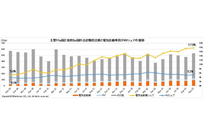 マークラインズ株式会社は、電気自動車の世界販売の約90%をカバーする主要14ヵ国を対象にグローバル市場における電気自動車の台数情報及び販売動向を分析した2022年9月の電気自動車(EV/PHV/FCV)販売月報(商用車を除く、推計値を含む)を掲載しました。