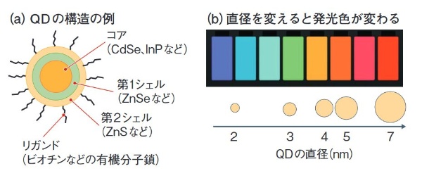図2 量子ドット(QD)のイメージと量子サイズ効果による発色の例