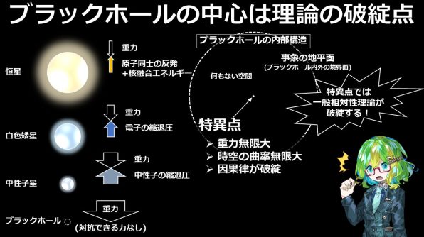 恒星サイズの天体が、重力に抵抗できず無限に潰れてしまった天体をブラックホールと呼び、その中心にある1点を「特異点」と呼んでいる。